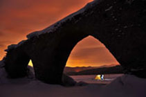 ●タウシュベツ橋梁 北海道遺産タウシュベツ橋梁(タウシュベツきょうりょう)は、北海道上士幌町の糠平湖にあるコンクリート製アーチ橋。「めがね橋」とも呼ばれている。岩崎は老朽化が進み崩壊が始まっているこの橋を、消えゆくまで撮り続けるつもりでいる。